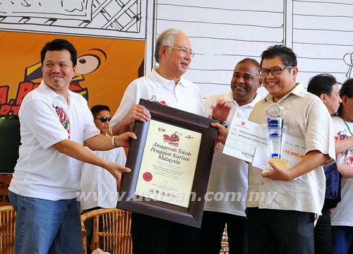 Najib Tun Razak menyampaikan Anugerah Kartunis Sepanjang Hayat kepada kartunis, Mohammad Nor Khalid atau lebih dikenali sebagai Lat pada majlis ramah mesra bersama kartunis di Pasar Budaya, Kuala Lumpur, semalam. Turut hadir Sohaimi Shahadan (kiri) dan Abdul Azeez Abdul Rahim (dua, kanan).